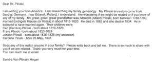 Zainteresowała mnie bardzo treść tego listu, a szczególnie jego nadawca. Nigdy dotychczas, jak pamiętam, w domu nie mówiło się, w każdym razie ja nie słyszałem o tym, że mamy rodzinę w Stanach Zjednoczonych. Całkowitym zaskoczeniem było dla mnie to, że nadawca tego listu, pani Sandra Hogan używa w nazwisku „Von Plinsky”. Bardzo ograniczone informacje, które udało mi się wiele lat temu uzyskać od wujka Antoniego z Żarnowca nie pozwalały absolutnie ustosunkować się do danych zawartych w jej liście. Dane te obejmowały okres znacznie wcześniejszy niż to co przekazał mi wujek Antoni. O jakichkolwiek dokumentach rodzinnych, czy wręcz rodowych nigdy nie słyszałem. Tak więc nie byłem przygotowany wówczas na jakąkolwiek sensowną korespondencję z Sandrą. Był to zresztą dla mnie wtedy dość trudny okres, byłem bardzo zajęty przekazywaniem funkcji rektora Uniwersytetu Gdańskiego mojemu następcy. Nie chcąc jednak tracić kontaktu z nadawcą listu, wysłałem do Sandry dnia 12 sierpnia 2002 roku krótką notkę, w której piszę, że jest duże prawdopodobieństwo iż jesteśmy spokrewnieni, gdyż moja rodzina również pochodzi z rejonu Gdańska. Jednakże wszelkie dokumenty rodzinne, jeżeli były, to niestety zaginęły podczas pierwszej, a szczególnie drugiej wojny światowej. Wspomniałem ponadto, że teraz będę miał czas na poszukiwania śladów mojego drzewa genealogicznego. Wiele czasu jednak minęło. Swoim drzewem genealogicznym zająłem się dopiero w 2004 roku.