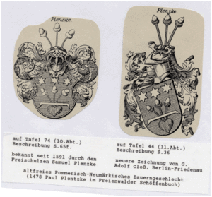 29 lipca 2005 roku otrzymałem od Rainera pocztę elektroniczną, w której opisuje najstarsze informacje odnoszące się do naszego rodu. Pierwsze wzmianki dotyczą Paula Plontzke z 1478 roku jako asesora („lay assessor”) w „Freienwalde”. Pierwsze informacje o herbie w rodzinie pochodzą z 1591 i wiązane są z Samuelem Plenzke; był on starostą w Jarosławsku(?) (Gerzlow). Prawdopodobnie jest on synem Joachima Plenske, którego nazwisko odnotowane jest w Uniwersytecie we Frankfurcie nad Odrą w 1564 roku; ten zaś jest synem Matthäeusa (Thewes) Plontzike, który w 1547 roku wykazany jest jako lennik w Jarosławsku i który ożenił się z córką (Churd on Wedel). Majątek w Jarosławsku został sprzedany w 1729 roku przez Joachima Ploentzke (=Ploenzig). Tu pojawia się oryginalna nazwa Ploenzig, która najprawdopodobnie pochodzi od miejscowości Ploenzig (aktualnie Płońsko). Według Rainera, któryś z tych przodków musi być założycielem mojej rodziny.
