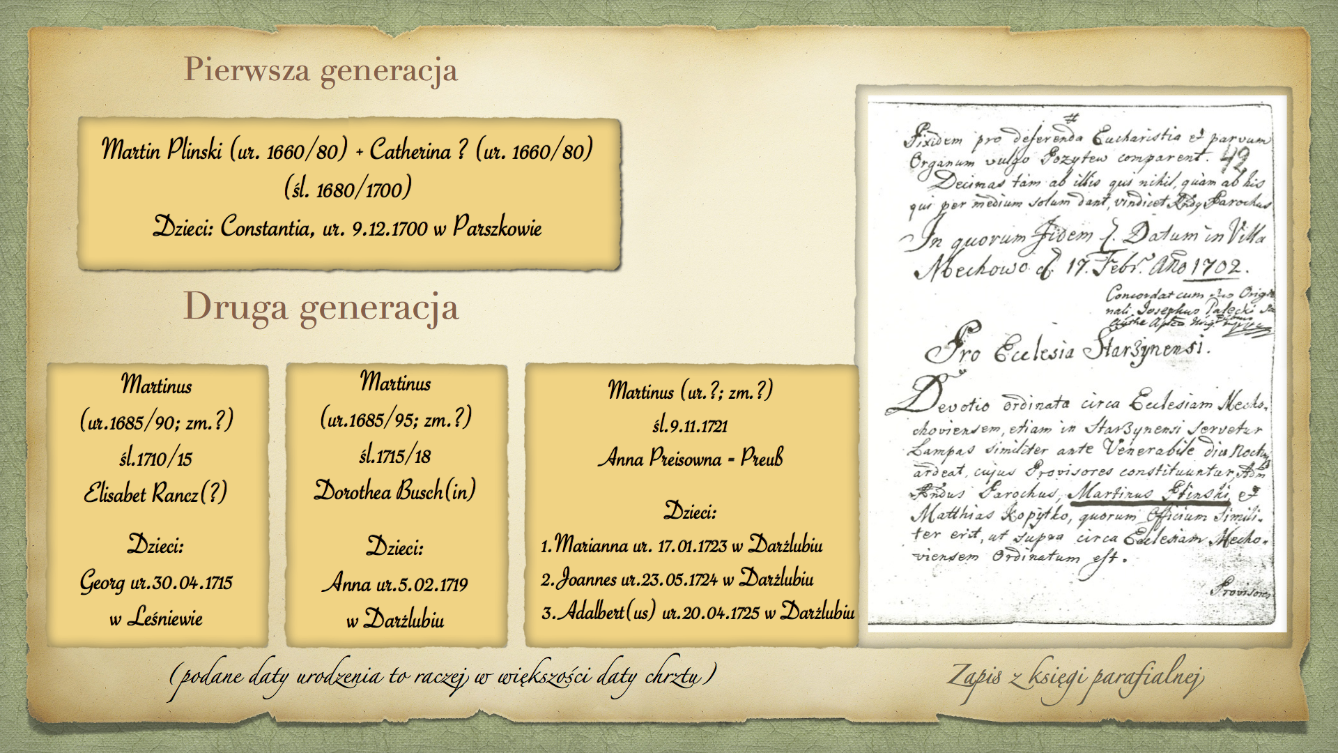 Dnia 24 kwietnia 2006 roku otrzymałem od Sandry list, w którym pisze, że ma trzech Marcinów w swoich zapiskach genealogicznych i są to: Martin Plinski, urodzony między 1660-1675 – żyjący w Parszkowie (Parschkau); Martin Plinski, urodzony między 1800-1803, zmarł 3.06.1881, był młynarzem w Mechowie; Martin Plinski, urodzony między 1735-1740, zmarł 9.04.1766, żył w Werblinii. Od Rainera dostałem list dopiero pod koniec lipca, do którego załączona była sporządzona przez niego lista pierwszych odnotowanych w północno-zachodnich prusach osób noszących nazwisko Pliński. Na liście tej, jako pierwsza generacja znajduje się Martin Plinski, żyjący w Parszkowie, urodzony około roku 1660/80, będący ojcem chrzestnym w Parszkowie w 1699 roku oraz w Kłaninie w 1701 roku. Ożenił się on w roku 1680/1700 z Catheriną (brak informacji o nazwisku), która była matką chrzestną w Werblini w 1701, 1703 i 1705 roku oraz w Kłaninie w 1711 roku. Zdaniem Rainera ten właśnie Martin jest tym samym, o którym jest mowa w dokumentach z wizytacji kościoła w Starzynie. Dane Rainera potwierdzają moje poszukiwania, z których wynika, że Martin Plinski figuruje w księgach parafialnych Mechowa (W 930) i Starzyna (W 1580) jako chrzestny w latach 1699, 1701, 1715, 1719, 1720 oraz jako świadek na ślubie w 1728 roku, zaś Catherina Plinska jako chrzestna w 1703 roku. Podanie jej nazwiska wskazuje na to, iż była to żona wzmiankowanego Martina. Domniemana data jego śmierci to rok 1730/40. Otwartym pozostaje pytanie, czy to właśnie byli nasi praprzodkowie na tych ziemiach. Jeżeli tak, to skąd oni się tu wzięli. W starszych księgach parafialnych Mechowy, obejmujących następujące miejscowości: Mechowo, Werblinia, Piaśnica, Domatowo, Starzyno, Darżlubie, Kłanino, Leśniewo, a sięgających początków siedemnastego wieku nie natrafiłem na jednoznacznie brzmiący wpis, który odnosiłby się do nazwiska Plinski. Rainer uważa, że ten Martin Plinski, o którym mowa nie jest w prostej linii naszym przodkiem, natomiast według niego pewne jest to, że naszym praprzodkiem jest Joannes Plinski, który urodził się w Werblini 9 czerwca 1765 roku, a ochrzczony został w Starzynie 11 czerwca 1765 roku.