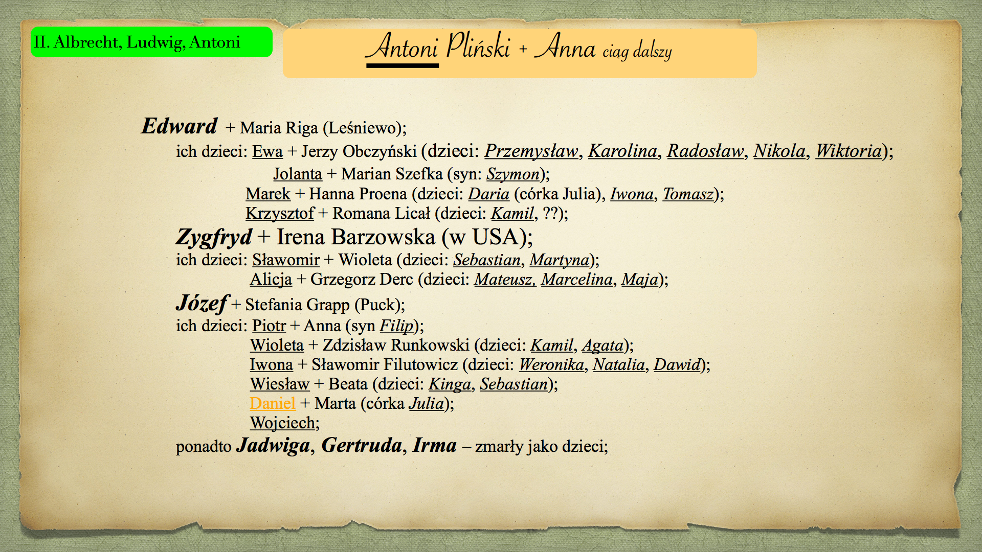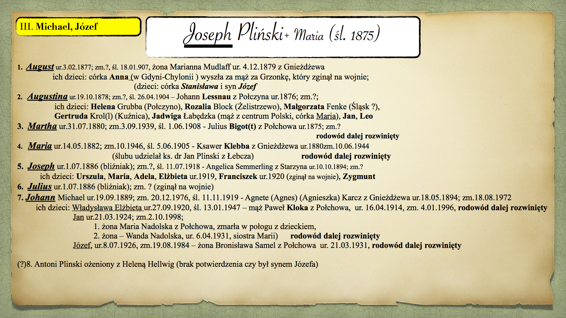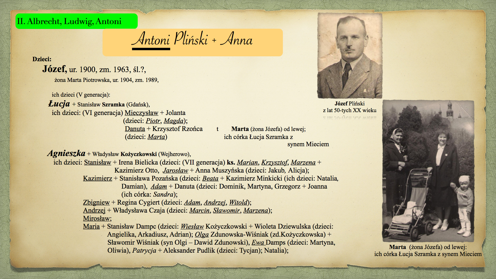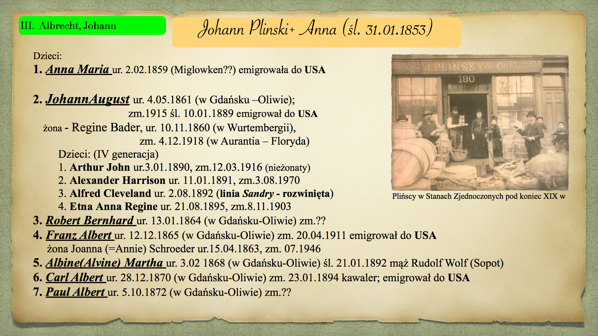 Linie te stanowią jakby trzon genealogii. Jednakże w księgach parafialnych napotkałem na nazwisko Pliński w Domatowie, Leśniewie, Parszkowie i innych okolicznych miejscowościach. Rainer pytał mnie o Plińskich, którzy figurują w zapisach ksiąg parafialnych w Pucku oraz o Aleksandra Plińskiego i jego siostry, którzy mieszkali na początku XX wieku w Oliwie (on miał mieć piekarnię). Ponadto wiem, że byli także Plińscy na południu Kaszub (Pliński Teodor – artysta rzeźbiarz kaszubski, Michał i Piotr Plinscy – dziedzice młyna jaminskiego w gminie Parchowo, rok nadania 1658/1688 wg Lustracji województw Prus Królewskich 1765). Znalazłem też prawie dwadzieścia zapisów z nazwiskiem Plinski w gdańskiej księdze mieszkańców (Danziger Einwohnerbuch) z roku 1939: Alfred, Artur, Bruno, Heinrich, Herbert, Johann (to jest chyba mój wujek, brat ojca), John, Karl, Kurt, Walter, Willi, Anna, Gertrud, Hedwig (dwa razy), Helene (dwa razy) i Karoline. Tak więc połączenie wszystkich wątków rodzinnych jest już chyba niemożliwe, aczkolwiek warto byłoby te „puzle” poskładać tak dalece jak się da.