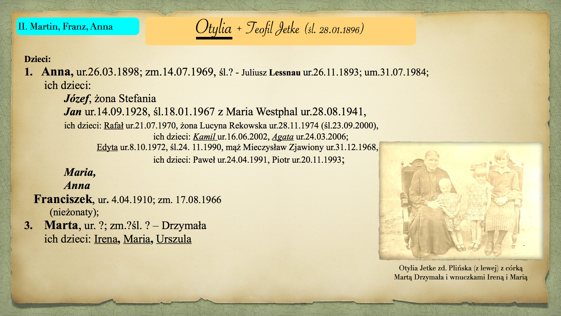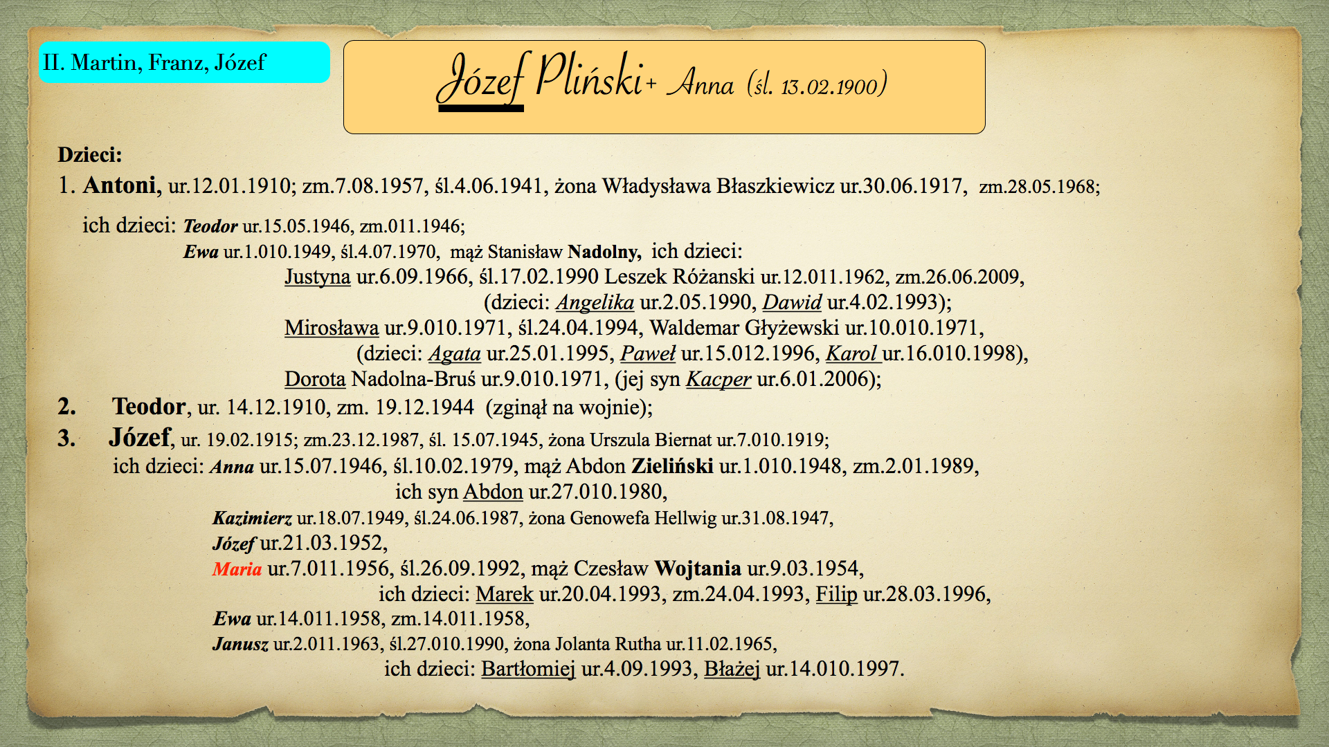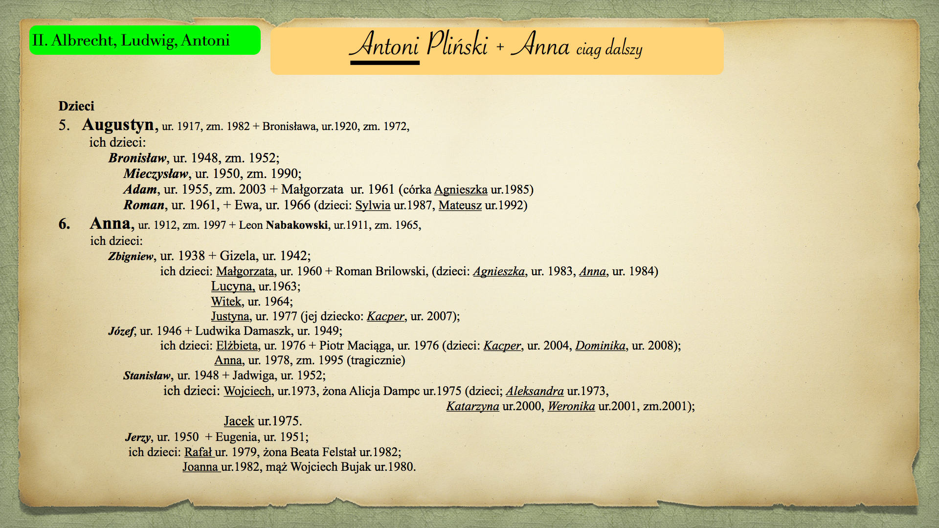 Linie te stanowią jakby trzon genealogii. Jednakże w księgach parafialnych napotkałem na nazwisko Pliński w Domatowie, Leśniewie, Parszkowie i innych okolicznych miejscowościach. Rainer pytał mnie o Plińskich, którzy figurują w zapisach ksiąg parafialnych w Pucku oraz o Aleksandra Plińskiego i jego siostry, którzy mieszkali na początku XX wieku w Oliwie (on miał mieć piekarnię). Ponadto wiem, że byli także Plińscy na południu Kaszub (Pliński Teodor – artysta rzeźbiarz kaszubski, Michał i Piotr Plinscy – dziedzice młyna jaminskiego w gminie Parchowo, rok nadania 1658/1688 wg Lustracji województw Prus Królewskich 1765). Znalazłem też prawie dwadzieścia zapisów z nazwiskiem Plinski w gdańskiej księdze mieszkańców (Danziger Einwohnerbuch) z roku 1939: Alfred, Artur, Bruno, Heinrich, Herbert, Johann (to jest chyba mój wujek, brat ojca), John, Karl, Kurt, Walter, Willi, Anna, Gertrud, Hedwig (dwa razy), Helene (dwa razy) i Karoline. Tak więc połączenie wszystkich wątków rodzinnych jest już chyba niemożliwe, aczkolwiek warto byłoby te „puzle” poskładać tak dalece jak się da.