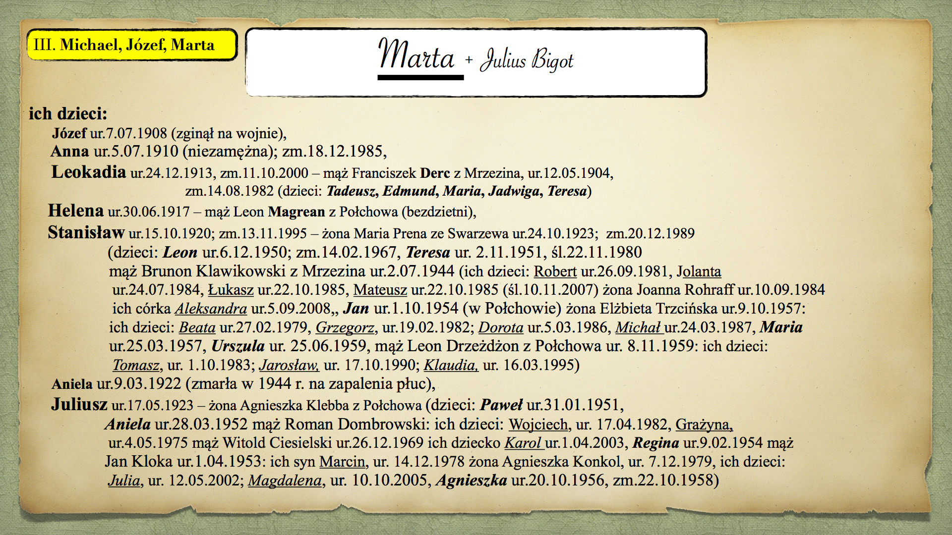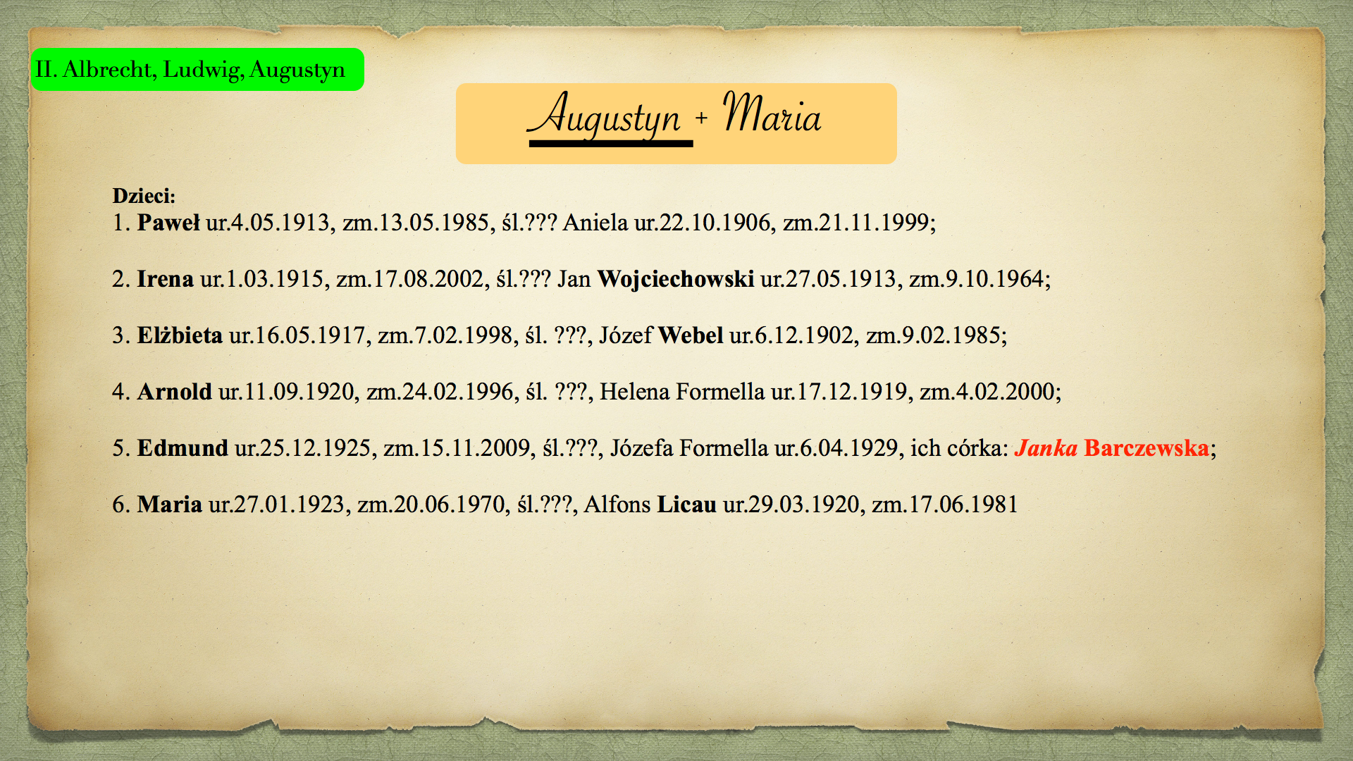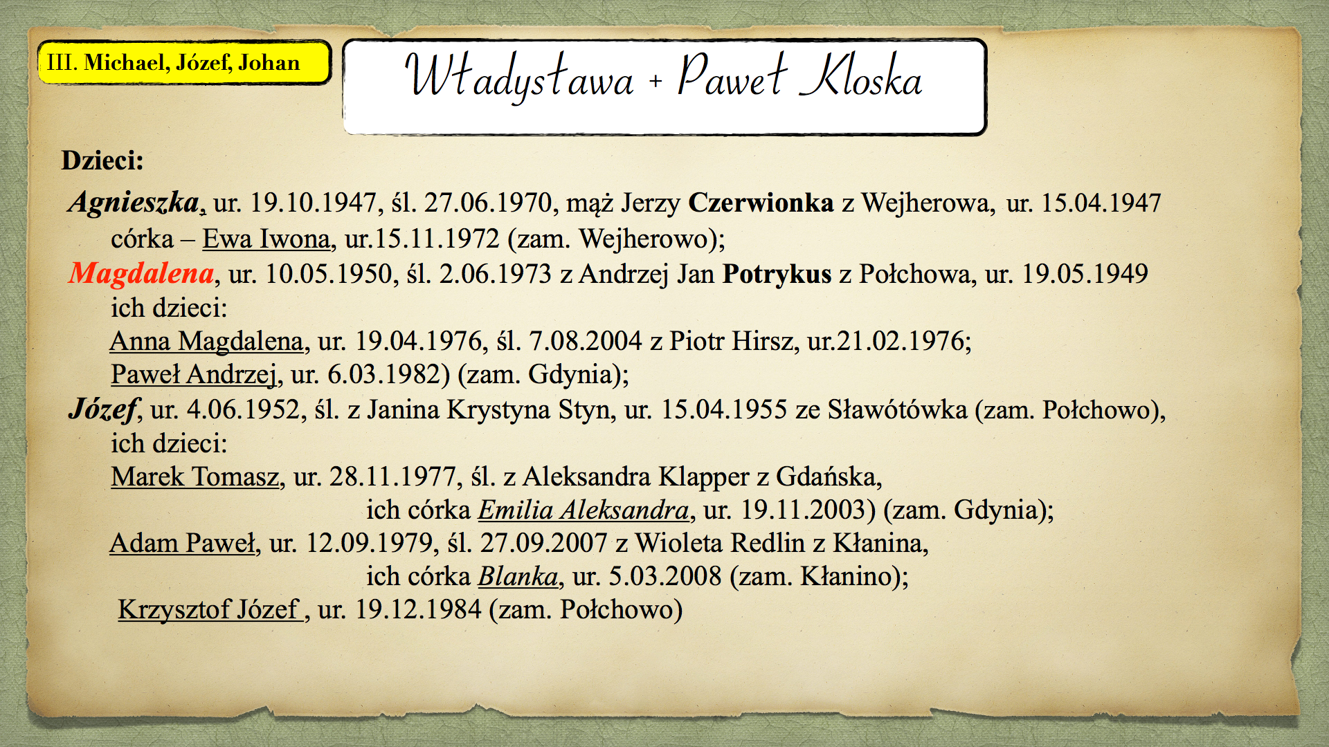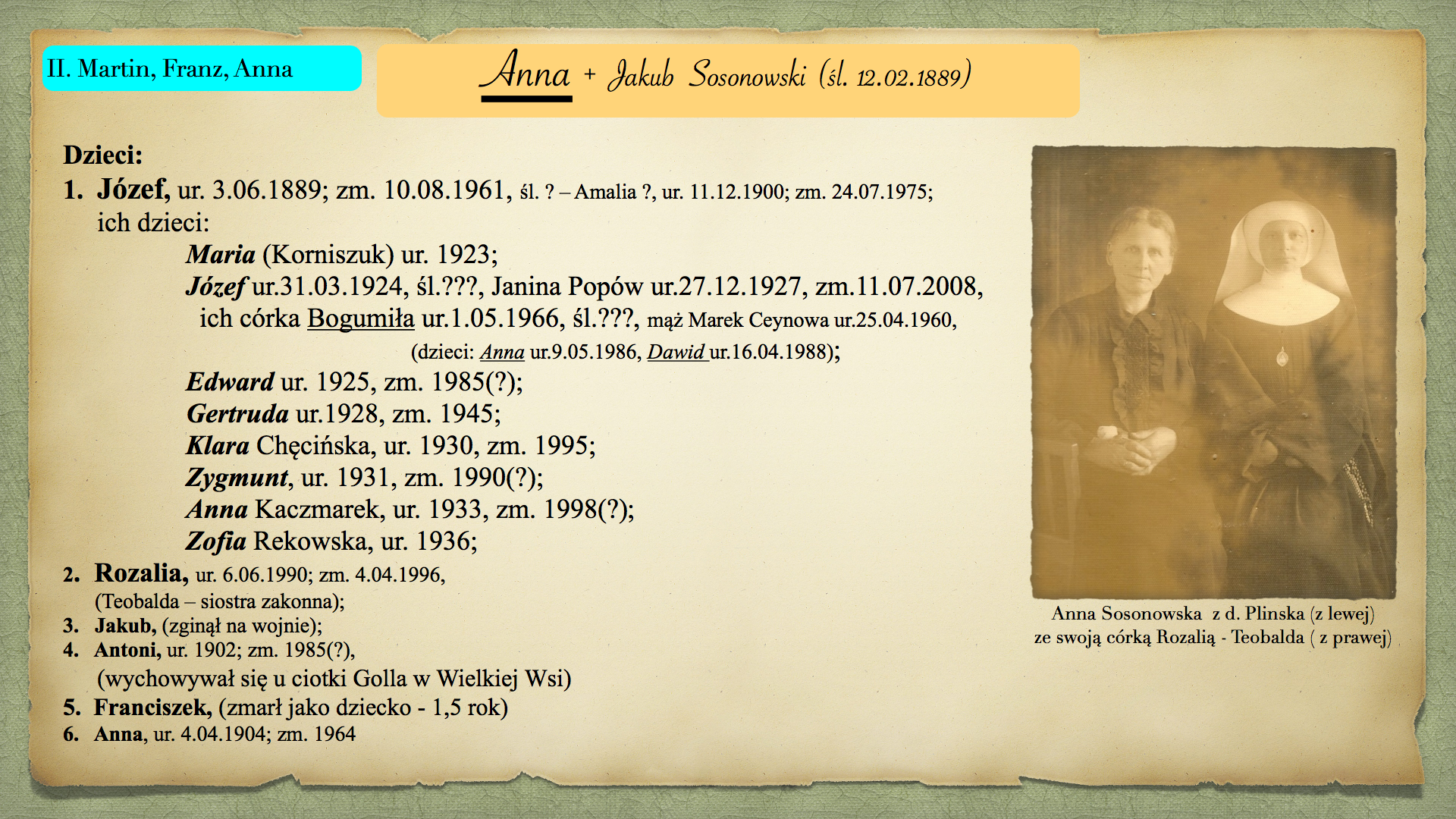 Linie te stanowią jakby trzon genealogii. Jednakże w księgach parafialnych napotkałem na nazwisko Pliński w Domatowie, Leśniewie, Parszkowie i innych okolicznych miejscowościach. Rainer pytał mnie o Plińskich, którzy figurują w zapisach ksiąg parafialnych w Pucku oraz o Aleksandra Plińskiego i jego siostry, którzy mieszkali na początku XX wieku w Oliwie (on miał mieć piekarnię). Ponadto wiem, że byli także Plińscy na południu Kaszub (Pliński Teodor – artysta rzeźbiarz kaszubski, Michał i Piotr Plinscy – dziedzice młyna jaminskiego w gminie Parchowo, rok nadania 1658/1688 wg Lustracji województw Prus Królewskich 1765). Znalazłem też prawie dwadzieścia zapisów z nazwiskiem Plinski w gdańskiej księdze mieszkańców (Danziger Einwohnerbuch) z roku 1939: Alfred, Artur, Bruno, Heinrich, Herbert, Johann (to jest chyba mój wujek, brat ojca), John, Karl, Kurt, Walter, Willi, Anna, Gertrud, Hedwig (dwa razy), Helene (dwa razy) i Karoline. Tak więc połączenie wszystkich wątków rodzinnych jest już chyba niemożliwe, aczkolwiek warto byłoby te „puzle” poskładać tak dalece jak się da.