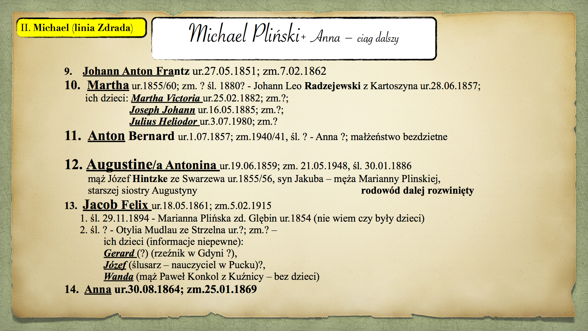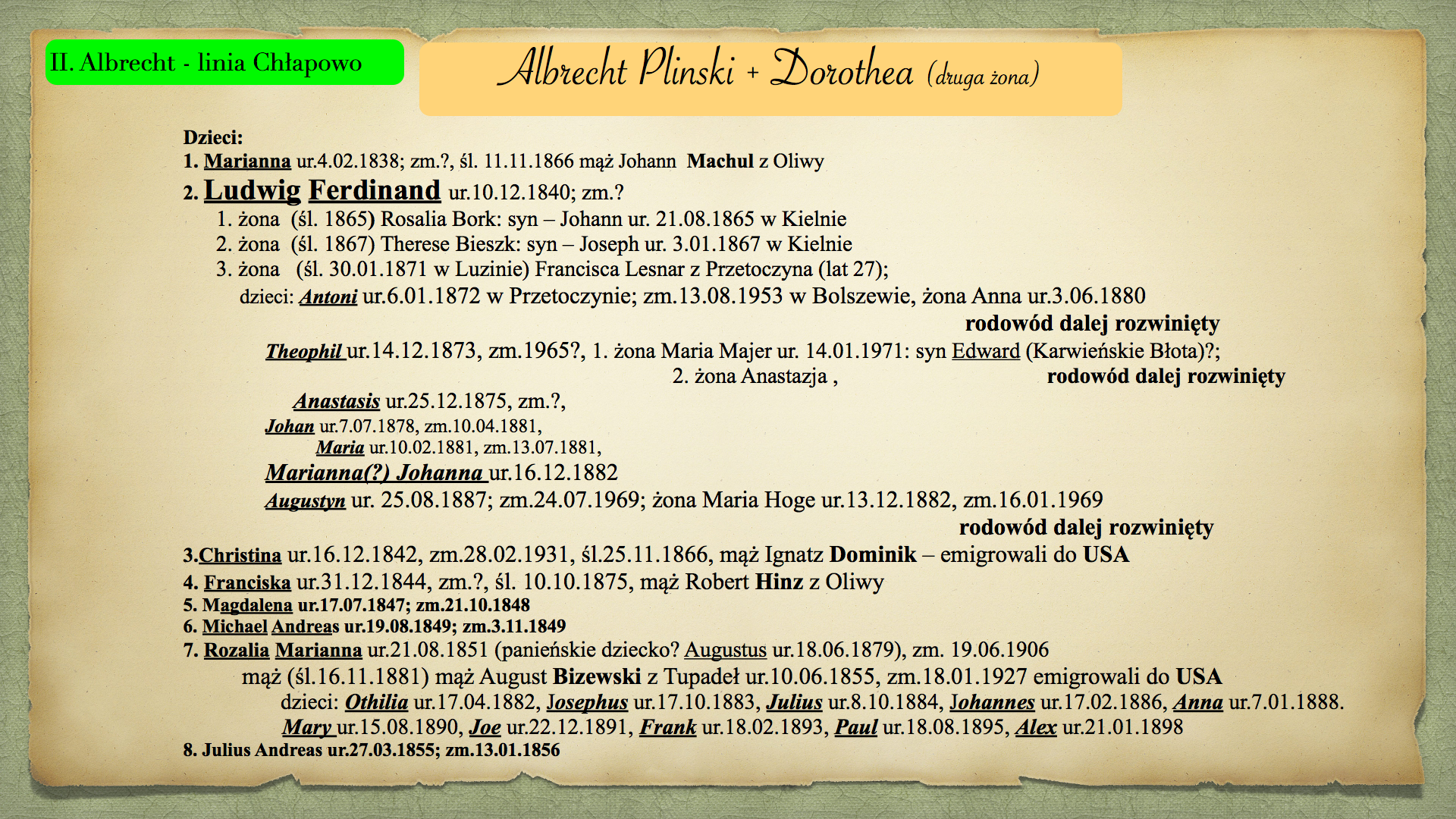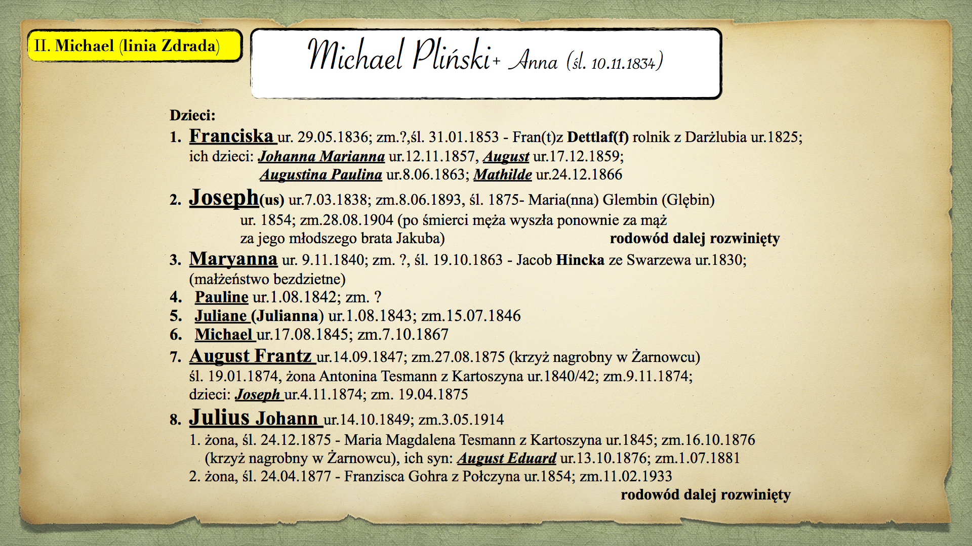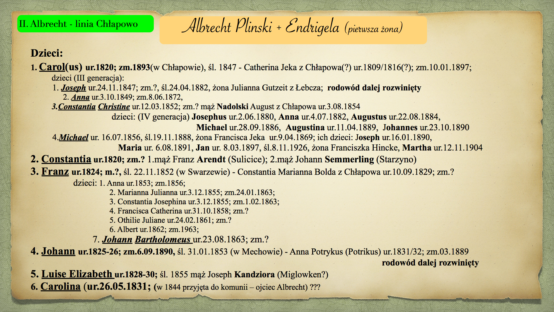 Problem ze skompletowaniem danych polega na tym, że są wyraźne braki w ciągłości ksiąg parafialnych z dawnych lat. W wielu przypadkach zapisy są prowadzone dość niestarannie, nie mówiąc już o specyfice charakteru pisma poszczególnych proboszczów. Wpisy były przecież dokonywane ręcznie. Mimo tych różnych trudności oraz braków w danych z pewnością mogę potwierdzić tezę Reinera, iż tu na terenach północnych Kaszub były cztery linie Plińskich, wywodzące się z Werblini, które zostały najprawdopodobniej zapoczątkowane przez czterech synów Johannesa Plinskigo i Evę z domu Gruba. Według dat urodzenia ich założycieli były to kolejno: