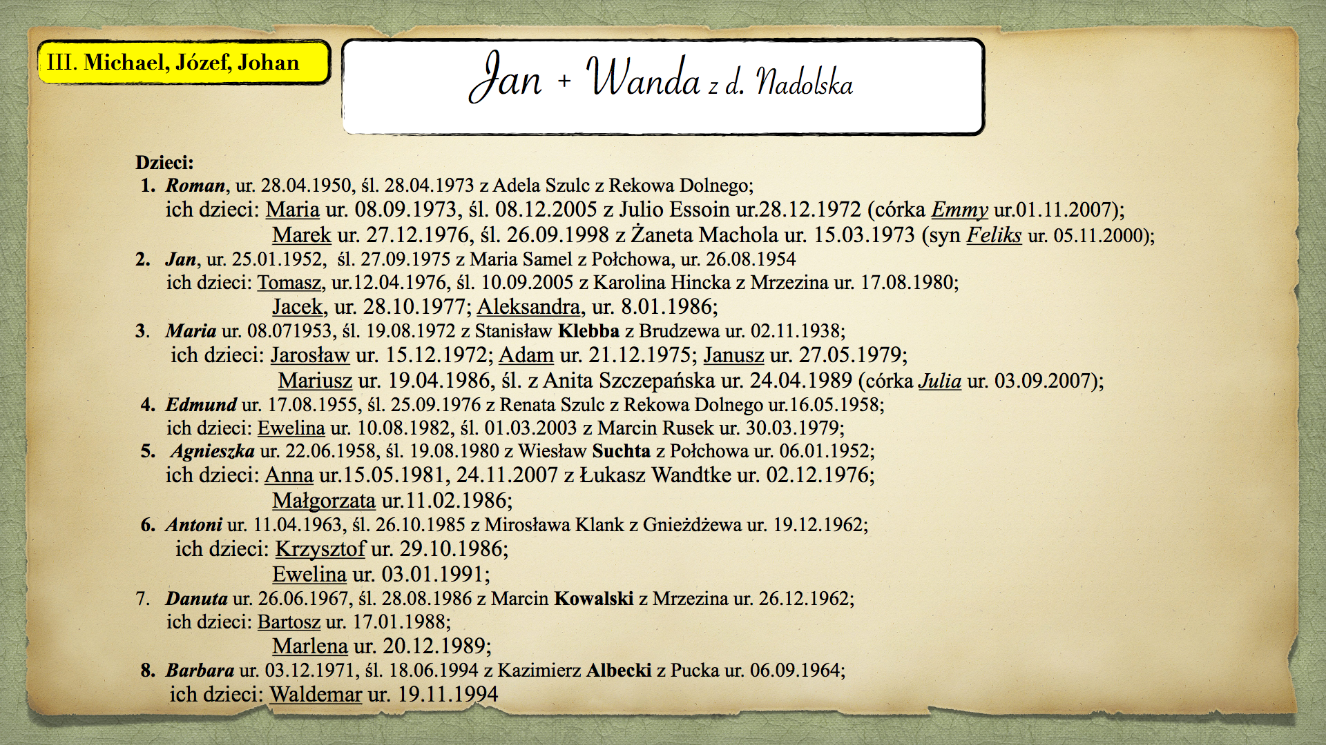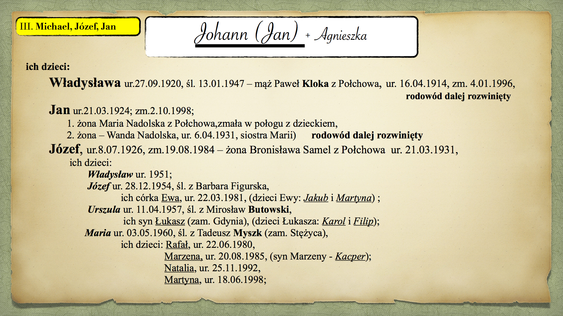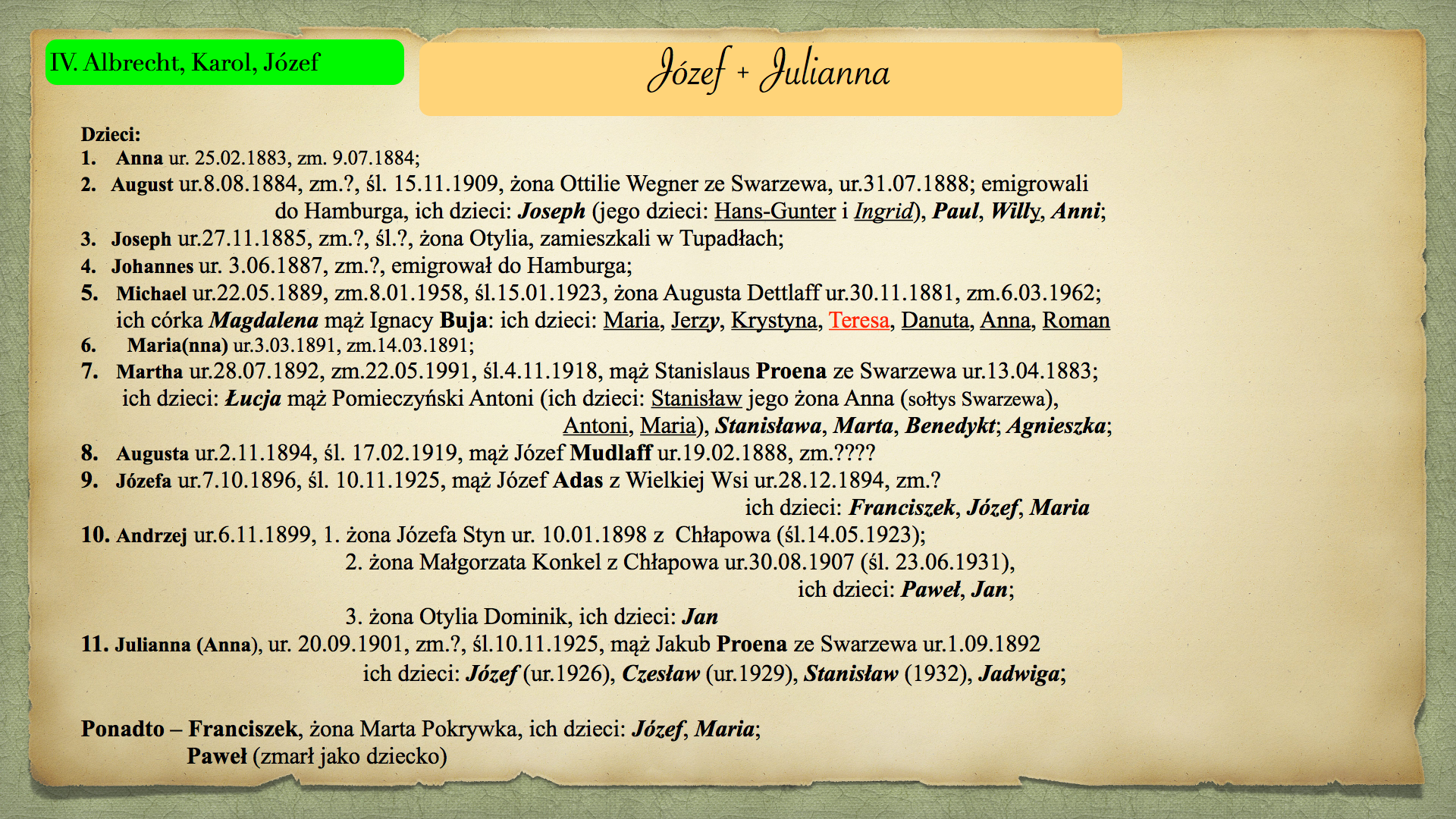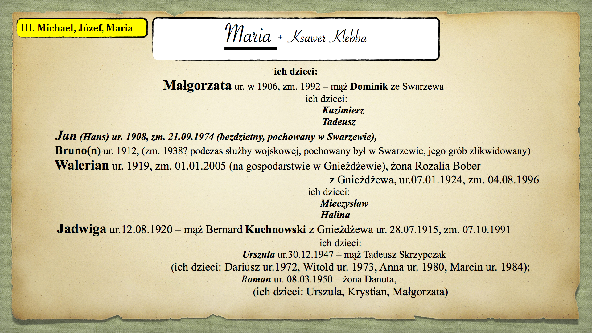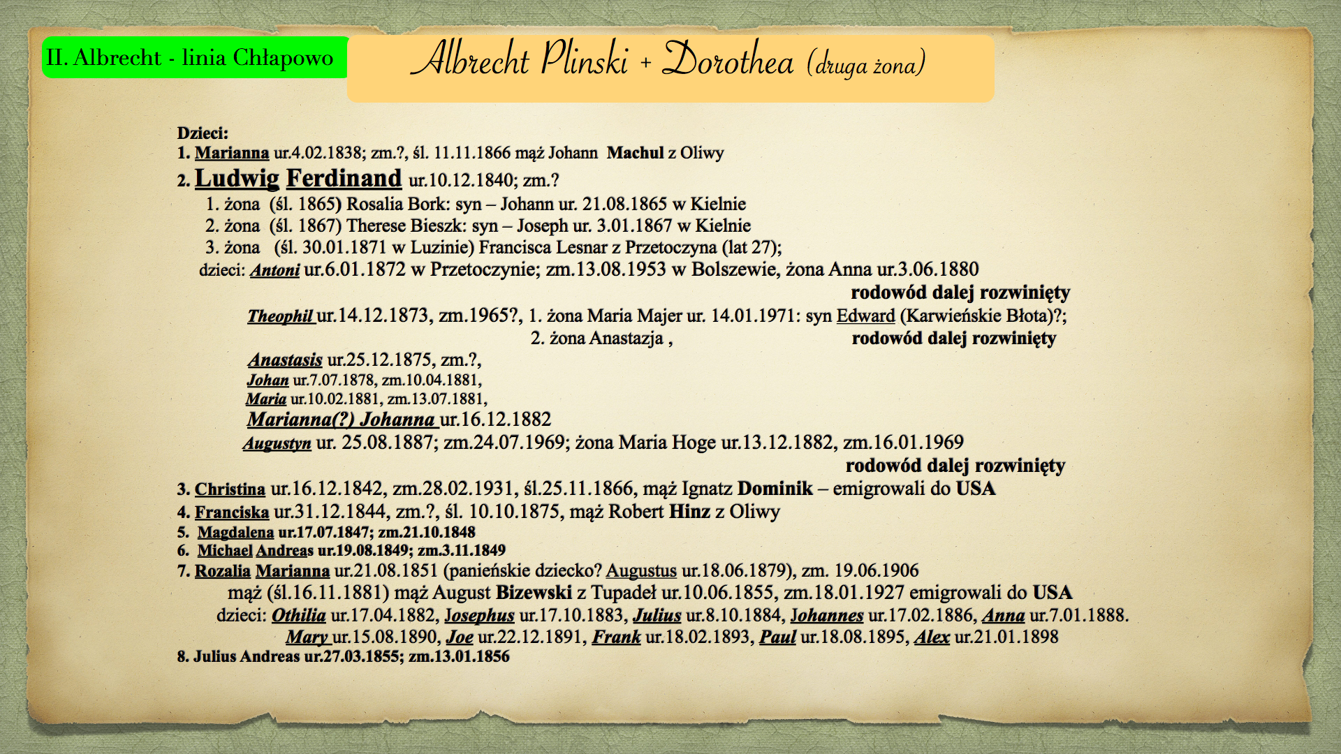 Problem ze skompletowaniem danych polega na tym, że są wyraźne braki w ciągłości ksiąg parafialnych z dawnych lat. W wielu przypadkach zapisy są prowadzone dość niestarannie, nie mówiąc już o specyfice charakteru pisma poszczególnych proboszczów. Wpisy były przecież dokonywane ręcznie. Mimo tych różnych trudności oraz braków w danych z pewnością mogę potwierdzić tezę Reinera, iż tu na terenach północnych Kaszub były cztery linie Plińskich, wywodzące się z Werblini, które zostały najprawdopodobniej zapoczątkowane przez czterech synów Johannesa Plinskigo i Evę z domu Gruba. Według dat urodzenia ich założycieli były to kolejno: