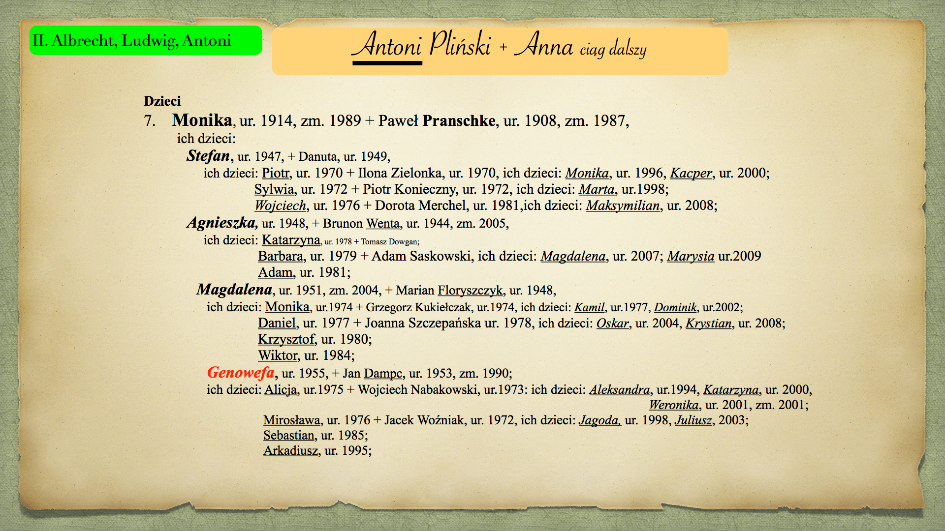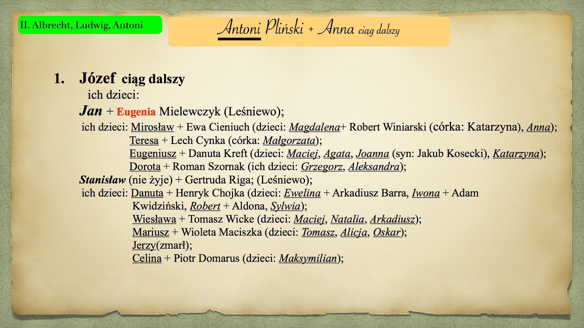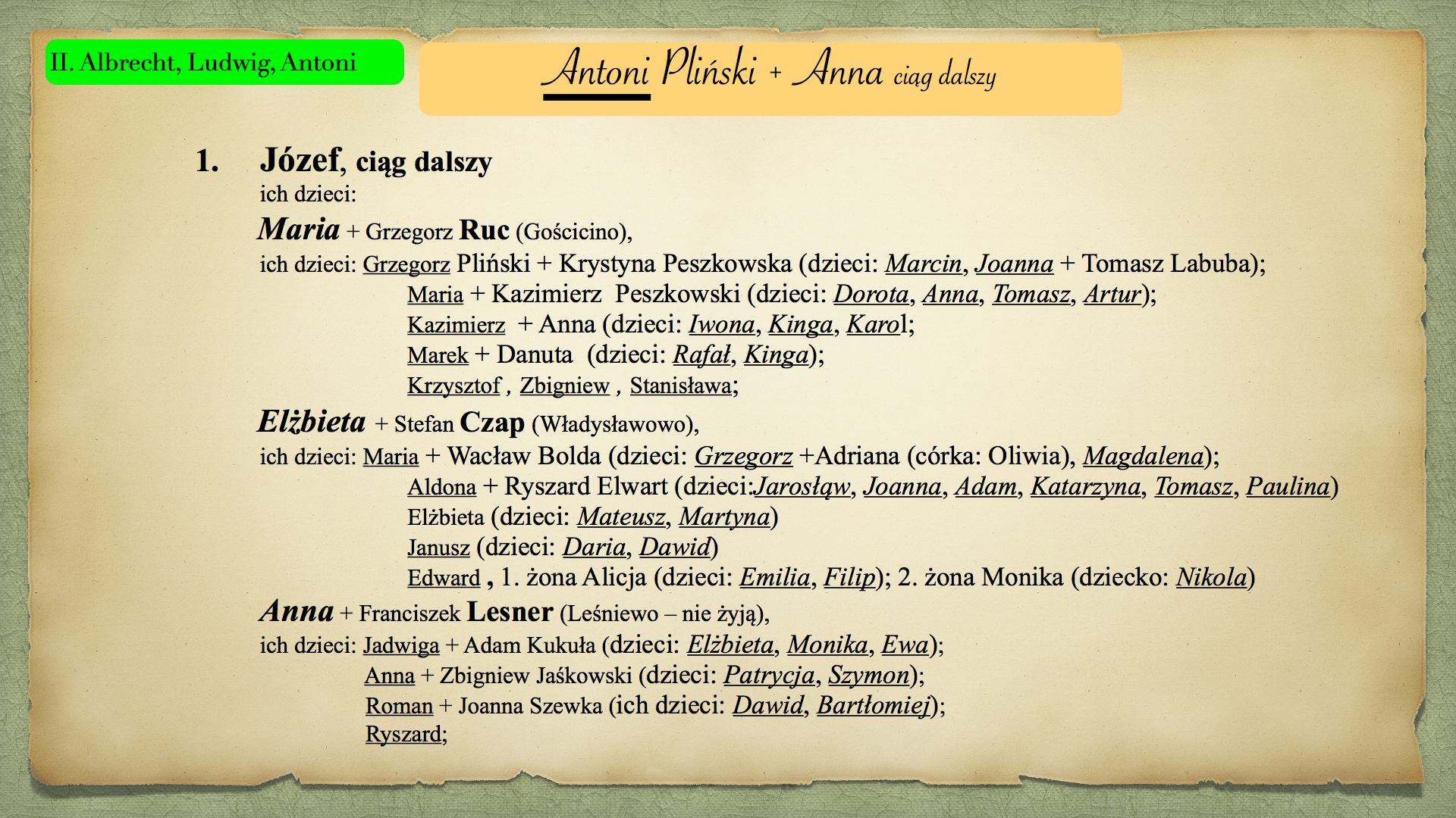 Tak więc z pewnością naszym protoplastą był Antonio Plinski z Werblini z tzw. trzeciej generacji (wg Rainera). Zasadnicze pytanie pozostaje w dalszym ciągu otwarte. W jakiej relacji tenże Antonio Plinski plasuje się w stosunku do drugiej, a szczególnie do pierwszej generacji wg Rainera. Czy jego dziadkiem był Martin, o którym piszę wyżej? Jeśli tak to kto jest jego ojcem. Co prawda tzw. drugą generację wg Rainera stanowią dwaj Martinus Plinski, jeden z Leśniewa, a drugi z Darżlubia. Analizując daty urodzin ich dzieci, uważam że jest to jeden mężczyzna, który ożenił się trzy razy. A może ożenił się po raz czwarty i z tego właśnie małżeństwa pochodzi Antonio? Jest to co prawda domniemanie, aczkolwiek dość prawdopodobne, ponieważ w księdze parafialnej Starzyna (W 1581) znalazłem zapis, iż w dniu 9 kwietnia 1766 roku zmarł Martinus Plinski w Werblini. Pozostaje oczywiście otwarte pytanie, czy ten właśnie Martinus Plinski jest synem Martina Plinskiego z pierwszej generacji, czego wykluczyć nie można. Jednak teza ta wymaga dalszych badań.