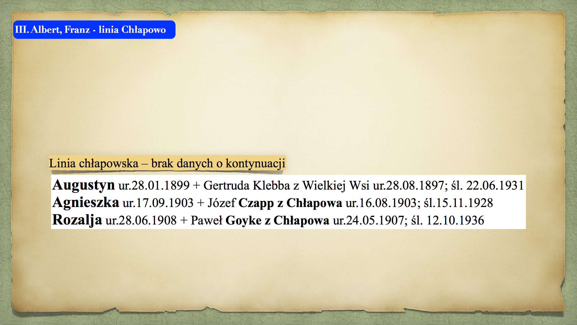 1. Linia chłapowska, której początek dał Adalbertus (Albert, Albrecht). Według Rainera miałby on się ożenić z Endrigelą Kruza, z którą miał sześcioro dzieci, wśród nich był Johann ożeniony z Anną z domu Potrykus – praprzodek Sandy ze Stanów Zjednoczonych. Chyba tenże sam Albert pojawia się w księgach parafialnych Swarzewa, jako mąż Dorothei Plinski z domu Krokowska vel Krukowski. Linia ta w XIX wieku była dość liczna w potomstwo.