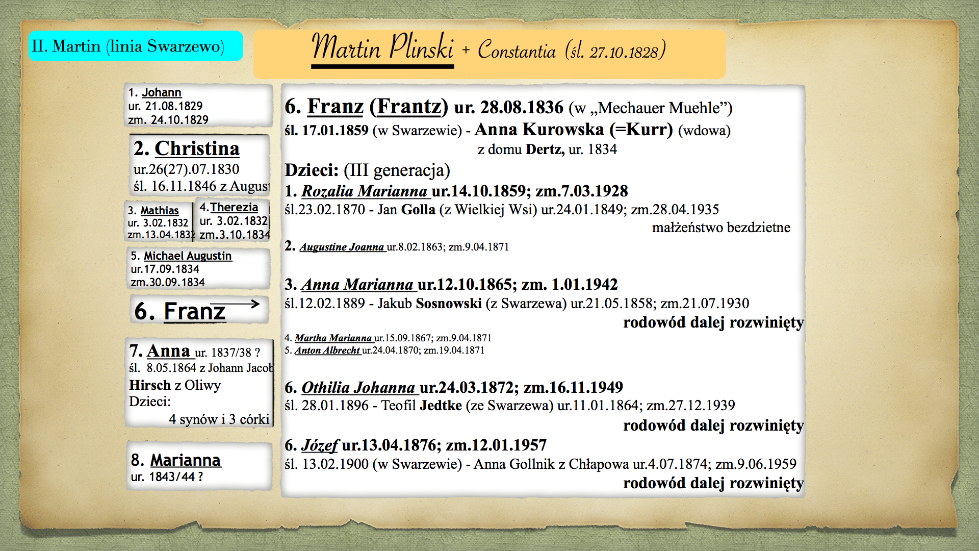 Dane, które przekazał mi Rainer w ostatnim liście, a dotyczą początków linii Plińskich z Werblini obejmują cztery generacje. Joannes Pliński został według Rainera zaliczony do czwartej generacji. Udało mi się w oparciu o zapisy w księgach parafialnych ustalić, że Joanni Plinski i Eva Gruba są rodzicami Martinusa urodzonego w 1802 roku. Jest on z pewnością założycielem linii Plińskich ze Swarzewa. W tej samej księdze (Mechowo W 931) pojawia się zapis, gdzie jako matka chrzestna figuruje Eva Plińska. Jest więc to potwierdzenie hipotezy Rainera, że rzeczywiście Joannes Plinski jest naszym protoplastą. Udało mi się jednak przesunąć genealogię o kolejny krok wstecz. Znalazłem zapis w księdze parafialnej w Starzynie (W 1581), że rodzicami Joanesa, urodzonego w 1765 są Antonio Plinski i Catherina. Oprócz Joanesa z tych samych rodziców urodzili się: Anna (1762), Laurentius (1768), Martinus (1775). Mniej więcej w tych samych latach pojawiają się zapisy o narodzinach Rochusa (1763) i Mariany (1764), których rodzicami są Martino Plinski i Anna. Ze względu na podobne brzmienie imion, nieco z włoska, Antonio i Martino śmiem sądzić, że byli braćmi. Hipoteza ta wymaga zweryfikowania. Obaj z pewnością żyli w Werblini. Są oni umieszczeni przez Rainera w trzeciej generacji.